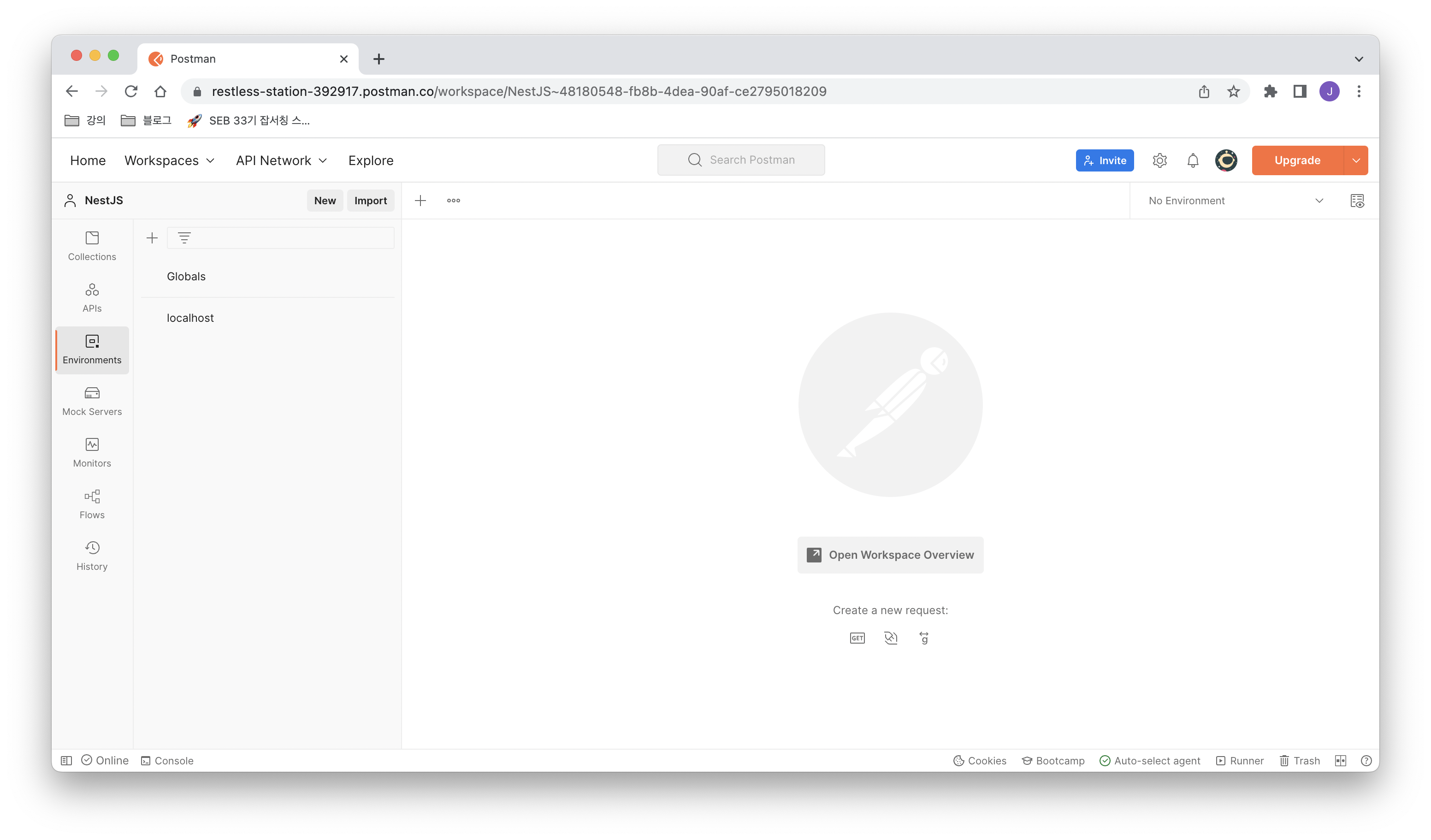 Environment를 생성하기 위해 Postman의 Environments에 접근해야한다.