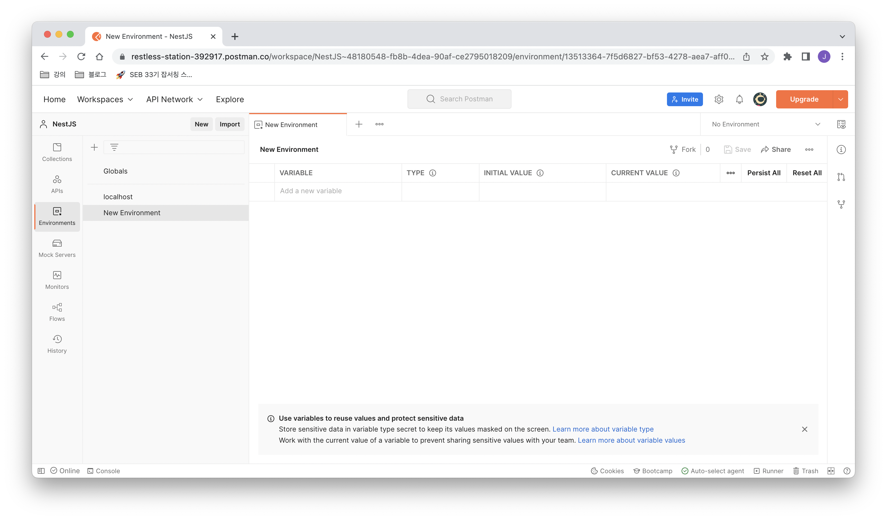 우측 상단에 'No Environment'를 클릭해서 만들어준 Enviroment를 선택한다.