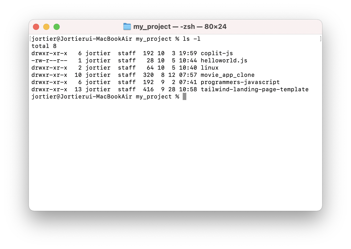 폴더 하나와 파일 하나를 생성했다. 이번에는 명령어 ls -l 을 입력한다.