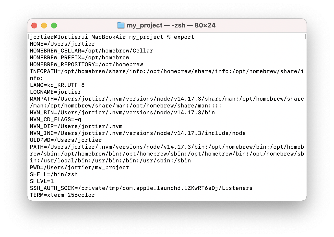 Linux 운영체제에는 이미 많은 환경변수가 설정되어 있다. 터미널에 명령어 export 를 입력해, 기록된 환경변수를 확인할 수 있다.