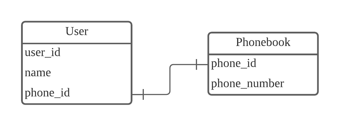 User 테이블은 user_id, name, phone_id를 가지고 있다. 이 중 phone_id는 외래키(foreign key)로써, Phonebook 테이블의 phone_id와 연결되어 있다. Phonebook 테이블은 phone_id와 phone_number를 가지고 있다.